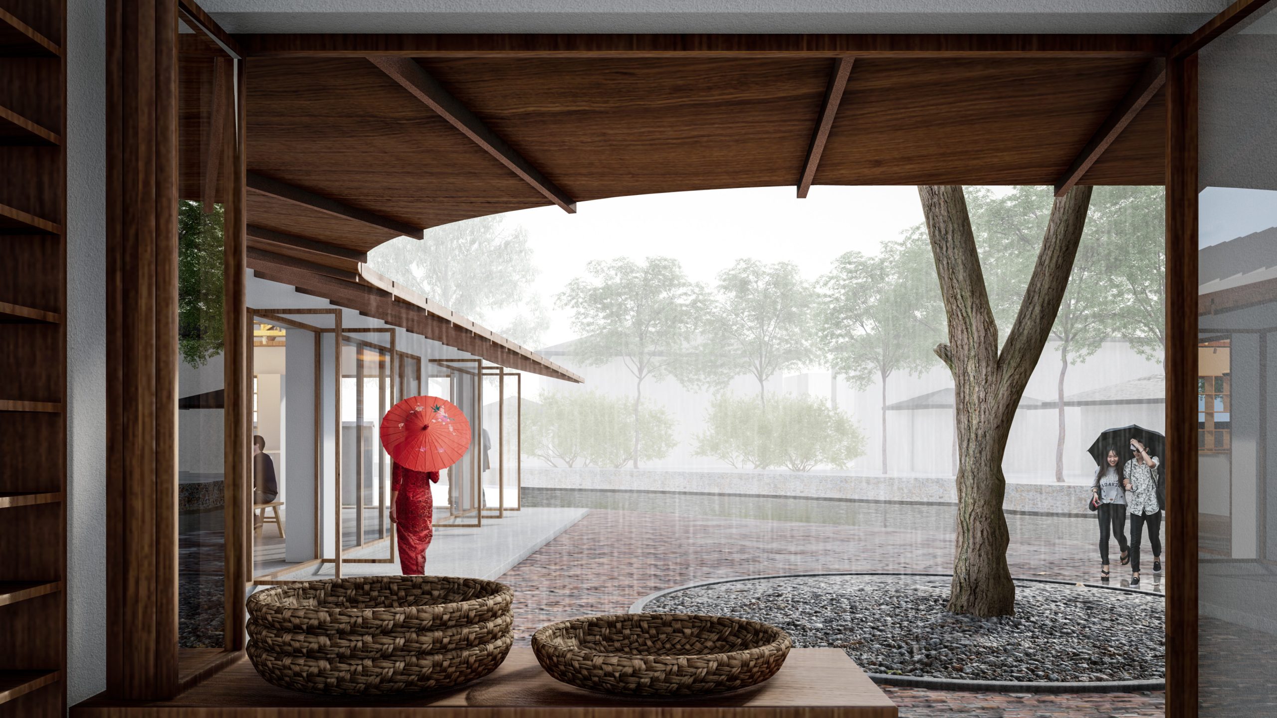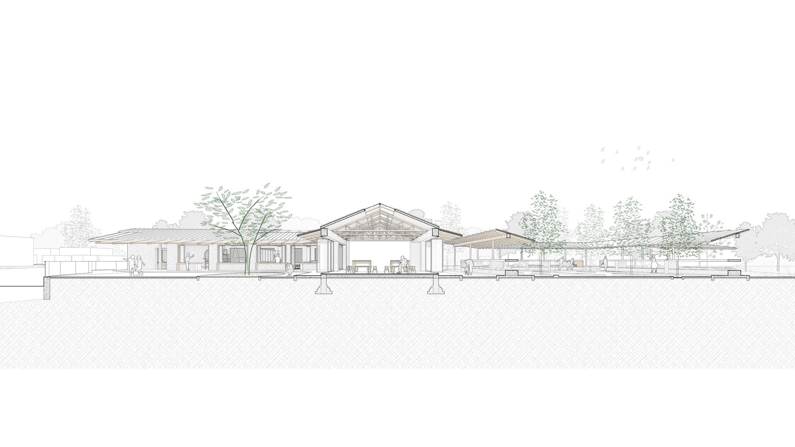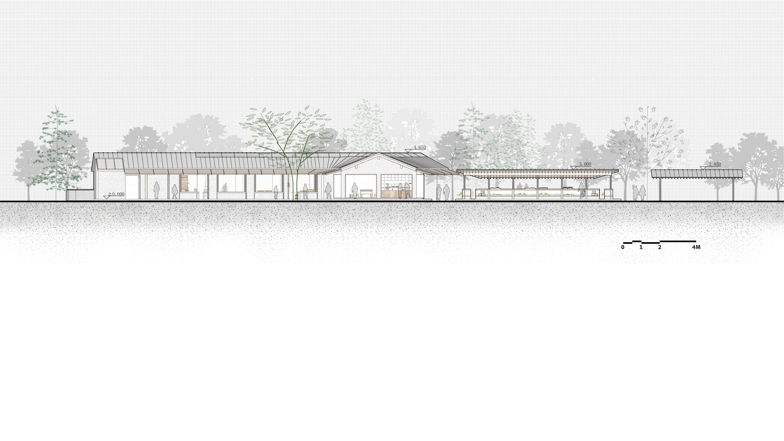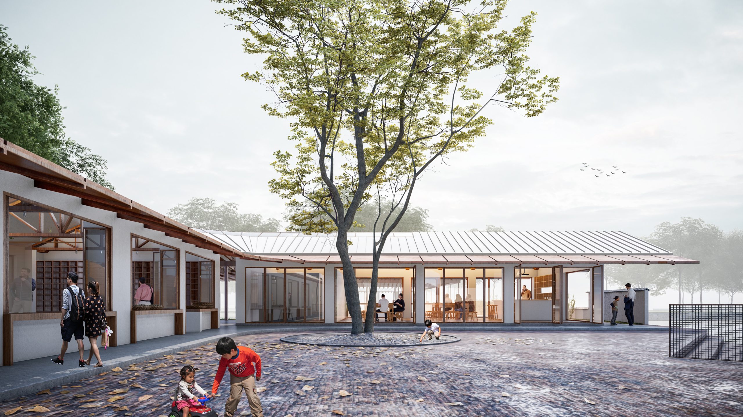 Renovation Concept: The Vacuum Forming Factory complex facing the bus terminal and Yuanjiadian archway defines the site’s importance as the gateway to Yuanjiadian. Between the factory and the bus platform, there are 16 matrix-arranged deciduous trees that form a natural space, perfect for transforming into a gathering and communication place for villagers. We will preserve 9 of these trees and construct a new corridor in the shape of the Chinese character “口” to enclose the rural market and the pavilion for rest. Three small buildings of the factory will be demolished, while two main buildings will be preserved and an additional roof in the shape of the Chinese character “人” will be added. The upper part of the “人” points to Dongzhuang and extends to a plank road leading to the paddy fields. The lower part of the “人” encloses a courtyard, accentuated by the planting of large trees, and a pedestrian bridge connects Yuanjiadian, facilitating the movement of villagers to and from Xizhuang.