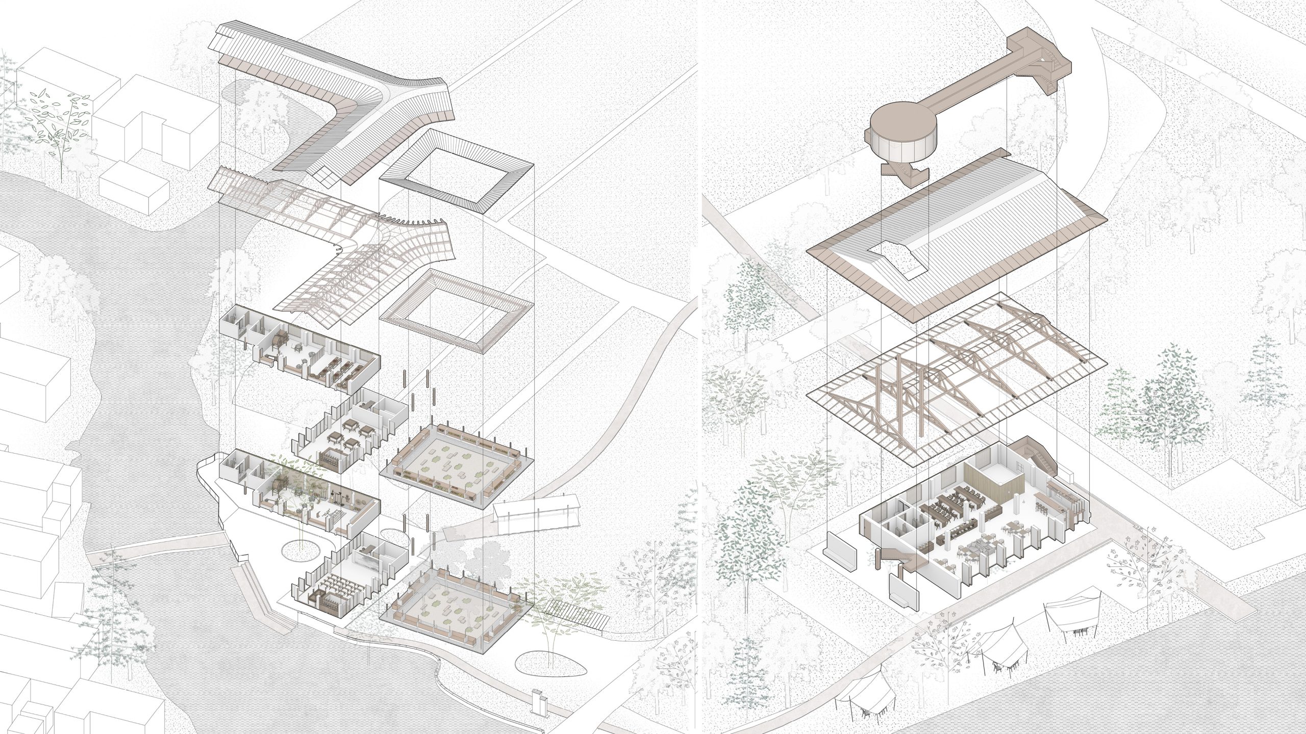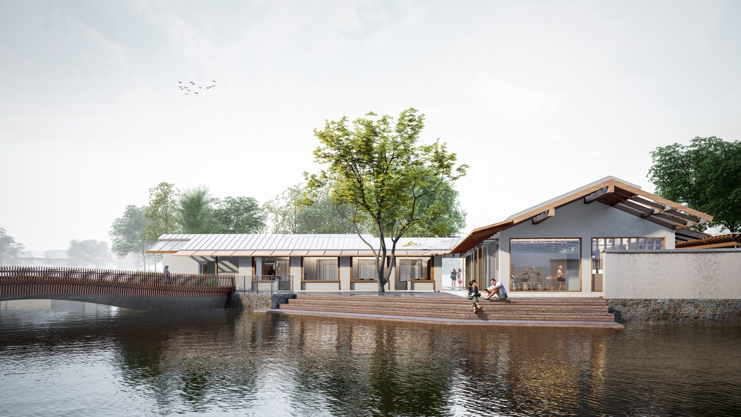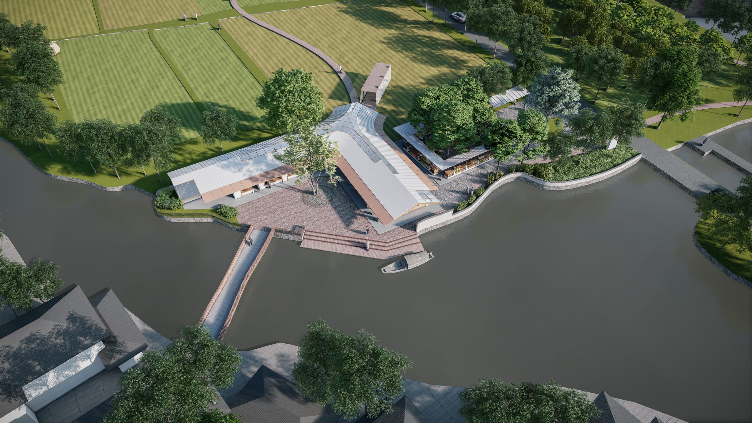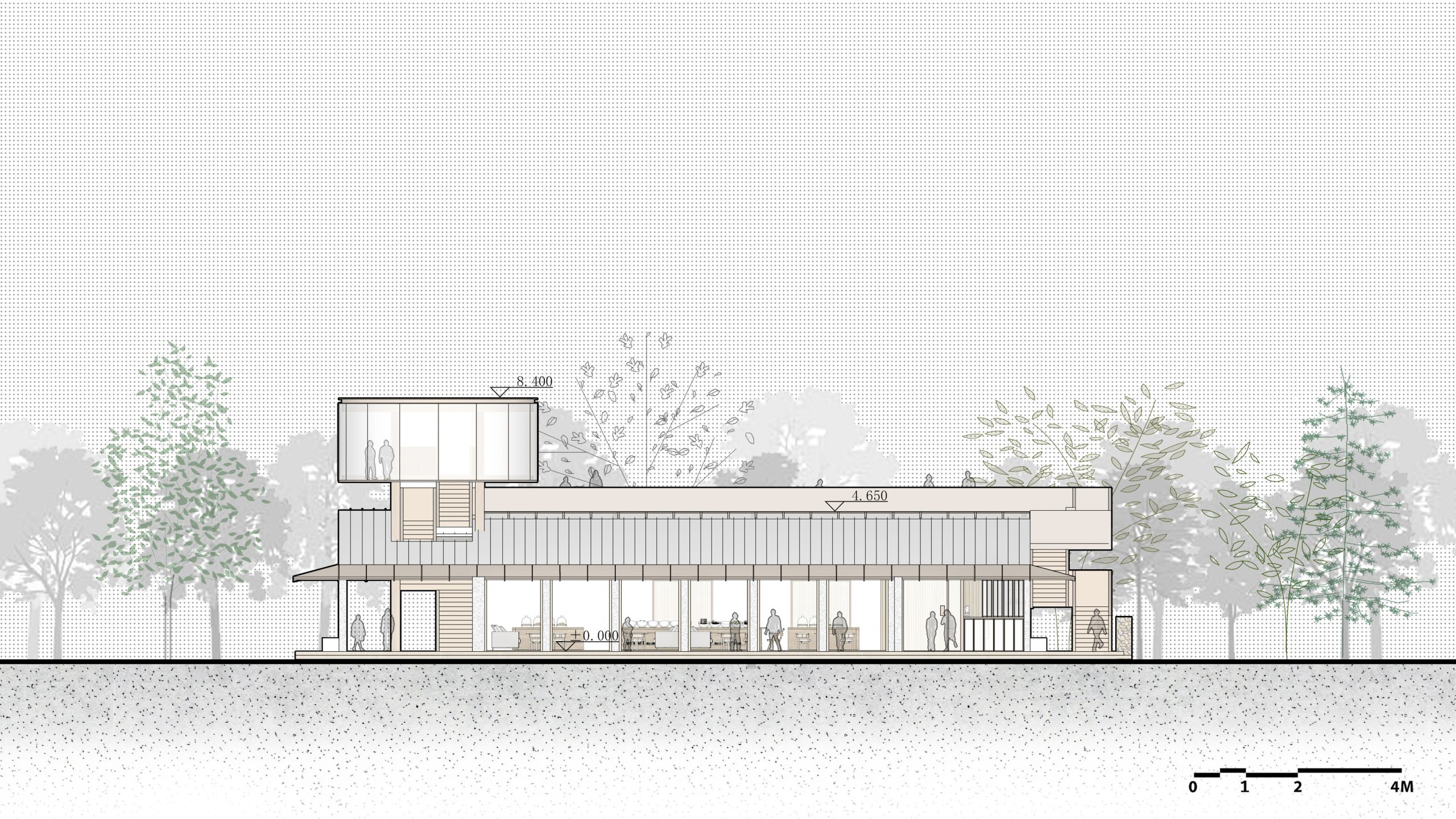 Renovation Concept: The Vacuum Forming Factory complex facing the bus terminal and Yuanjiadian archway defines the site’s importance as the gateway to Yuanjiadian. Between the factory and the bus platform, there are 16 matrix-arranged deciduous trees that form a natural space, perfect for transforming into a gathering and communication place for villagers. We will preserve 9 of these trees and construct a new corridor in the shape of the Chinese character “口” to enclose the rural market and the pavilion for rest. Three small buildings of the factory will be demolished, while two main buildings will be preserved and an additional roof in the shape of the Chinese character “人” will be added. The upper part of the “人” points to Dongzhuang and extends to a plank road leading to the paddy fields. The lower part of the “人” encloses a courtyard, accentuated by the planting of large trees, and a pedestrian bridge connects Yuanjiadian, facilitating the movement of villagers to and from Xizhuang.